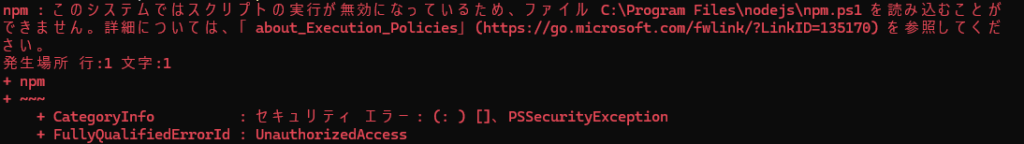 npm : このシステムではスクリプトの実行が無効になっているため、ファイル C:\Program Files\nodejs\npm.ps1 を読み込むことができません。詳細については、「about_Execution_Policies」(https://go.microsoft.com/fwlink/?LinkID=135170) を参照してください。