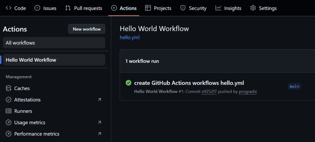 先ほど、hello.ymlで設定したワークフロー名「Hello World Workflow」が表示されます。