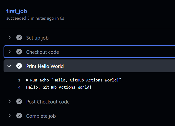 run: echo "Hello, GitHub Actions World!"git add と git commit