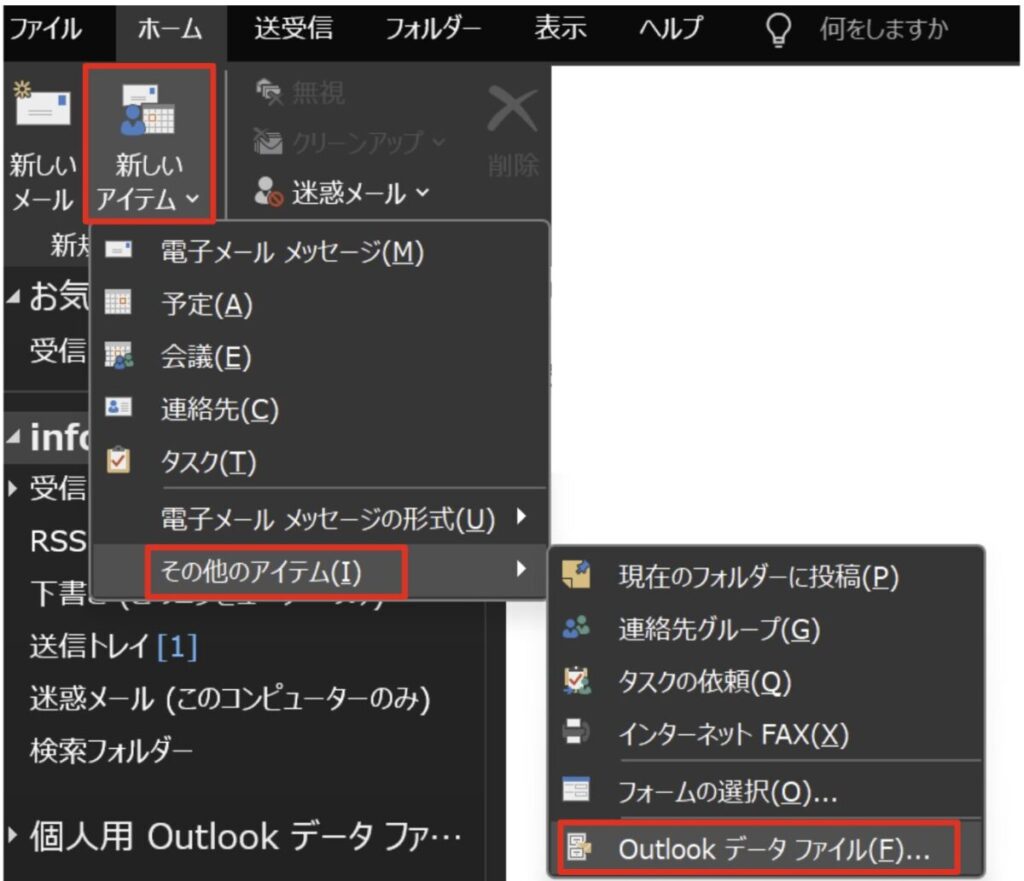 対象のアカウントを選択した状態で、「新しいアイテム > その他のアイテム > Outlookデータファイル」を選択します。