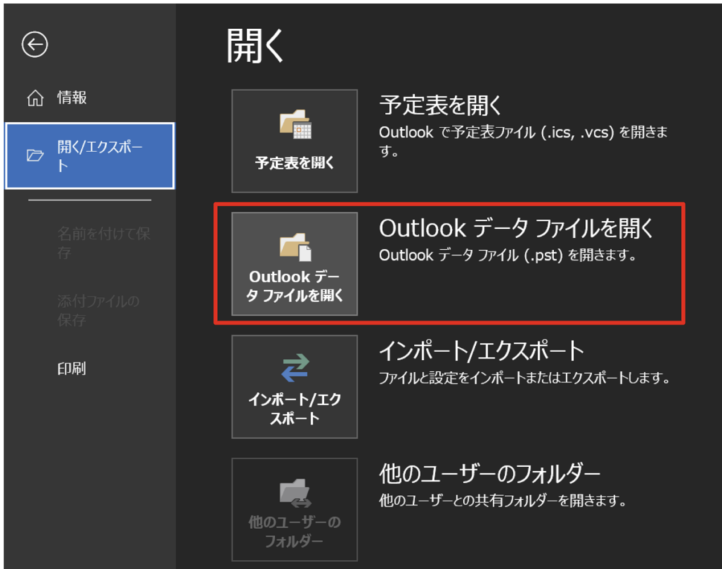 .pstファイルを読み込むには、「ファイル > 開く/エクスポート > Outlookデータファイルを開く」に進みます。