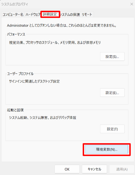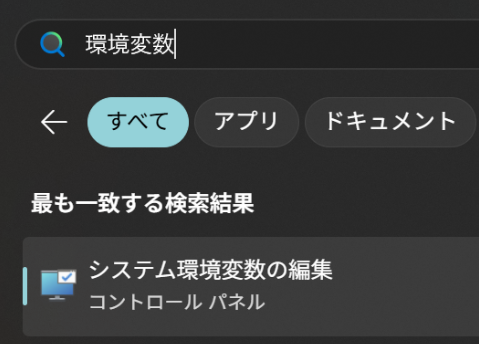 Windowsキーをクリックし「環境変数」と検索し、「システム環境変数の編集」を開きます。