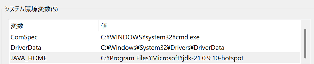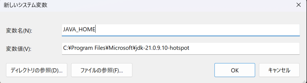 - 変数値:C:\Program Files\Microsoft\jdk-21.0.9.10-hotspot
