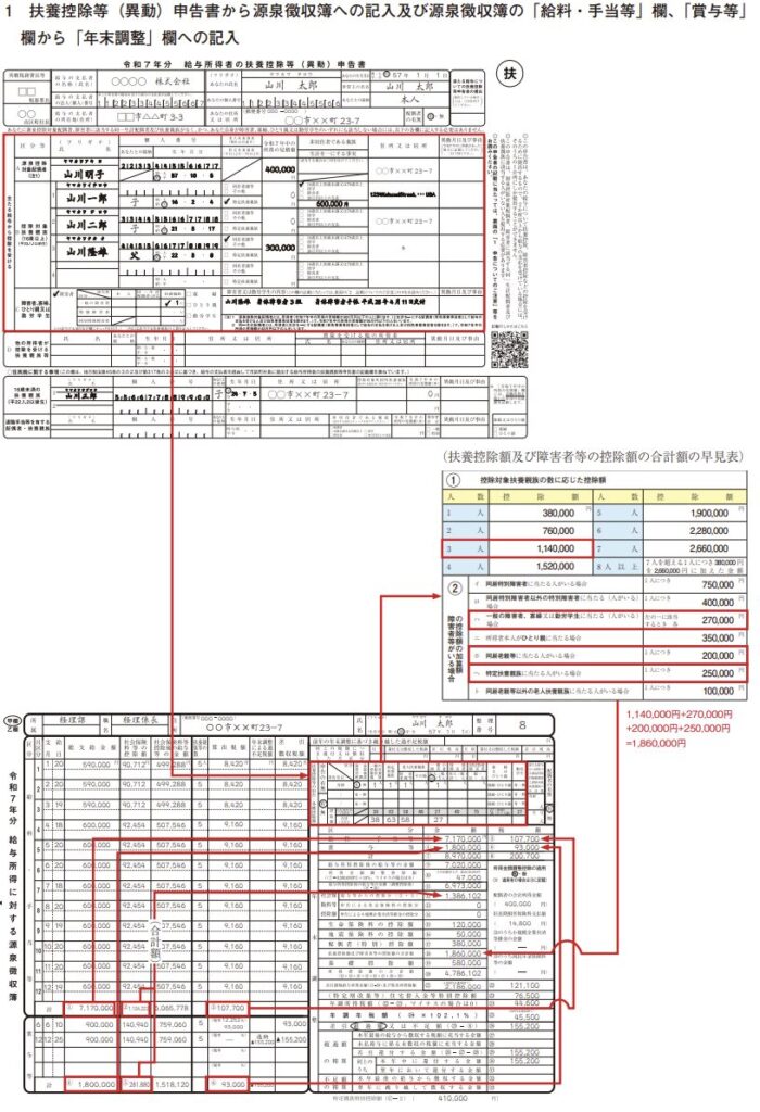・年末調整の計算: 裏面等を使用して、1年間の総所得から最終的な所得税額を算出する。