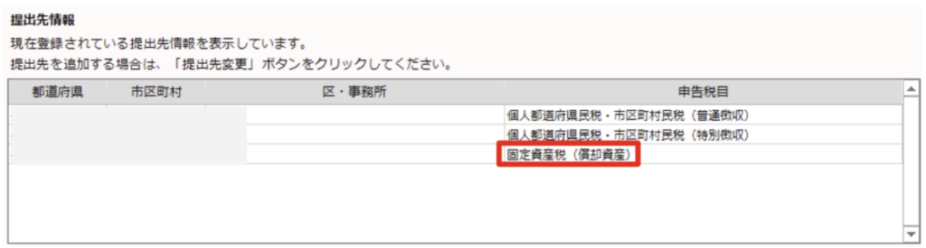 提出先に「固定資産税(償却資産)」があることを確認します。(※ない場合は別途登録が必要です。eLTAXで後から追加できます)