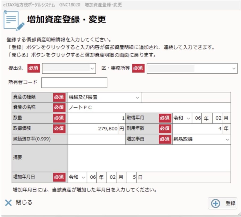 eLTAXの申告では、最初に「増加資産/減少資産」の登録を行います。