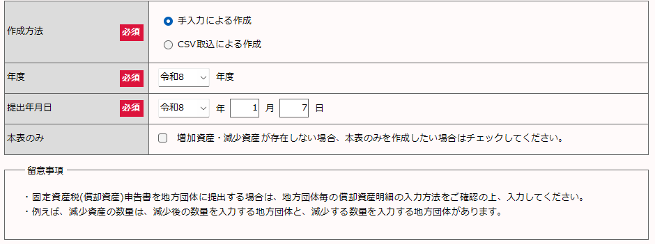 eLTAX上で申告データを作成してく場合は「増加資産/減少資産申告」を選択します。この場合、評価額の計算は提出先の自治体が行います(一般的な方法)