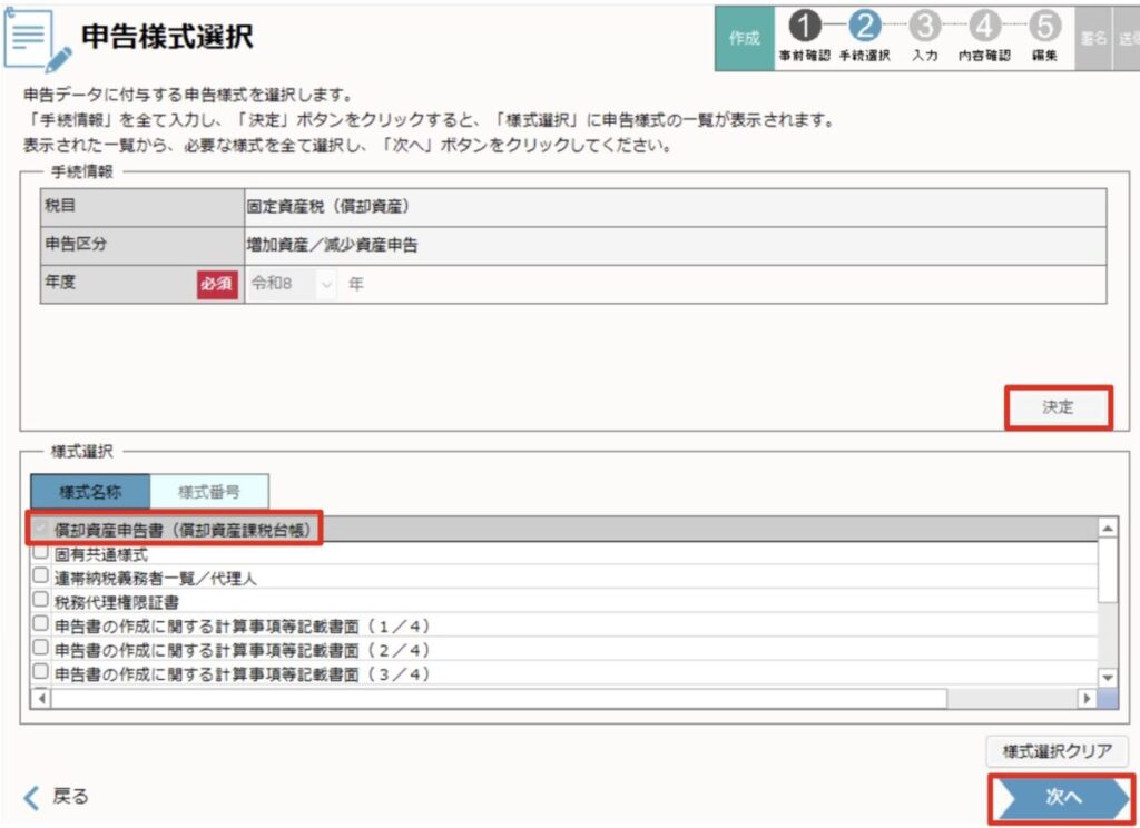 「決定 > 償却資産申告書」を選択し、署名・送信を行います。