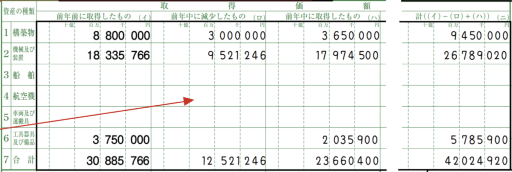 上記例では、機械及び装置で 9,521,246円分が減少しています。これを引くことで税金を安くできます。