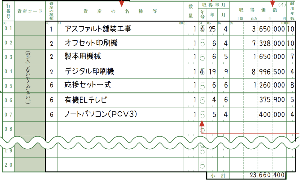 償却資産申告書は、資産のカテゴリーごとに金額を記入します。