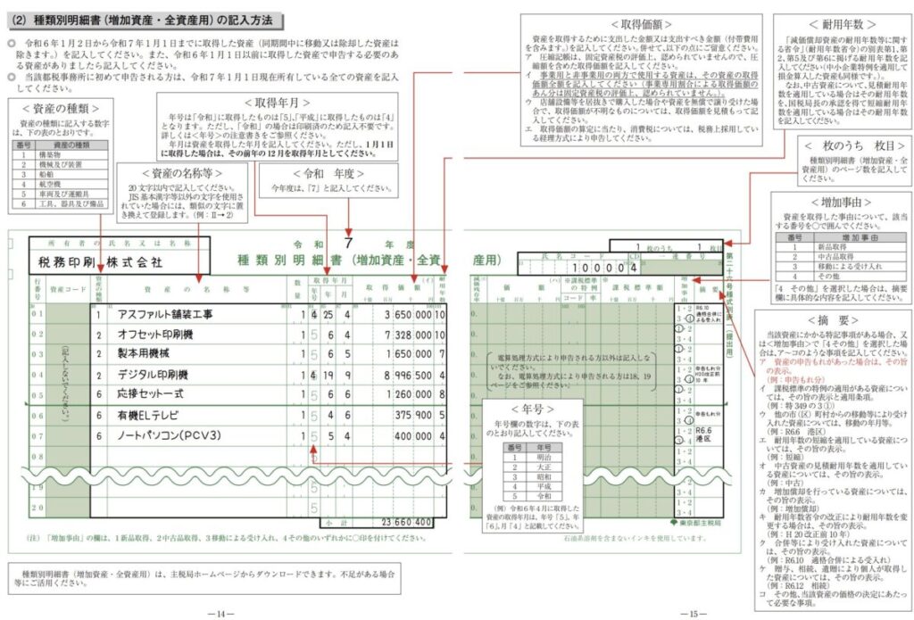 種類別明細書(増加資産・全資産用)には、償却資産申告書の「前年中に取得したもの」の詳細を記入します。