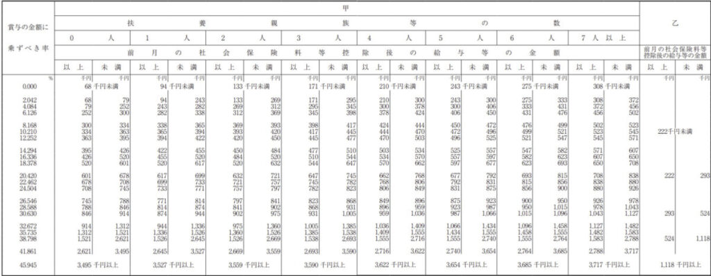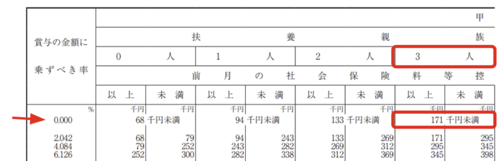 例えば、扶養者数が3人で、前月の社会保険料控除後の給与が17万1千円以下の場合、源泉徴収は0%、すなわち0円になります。