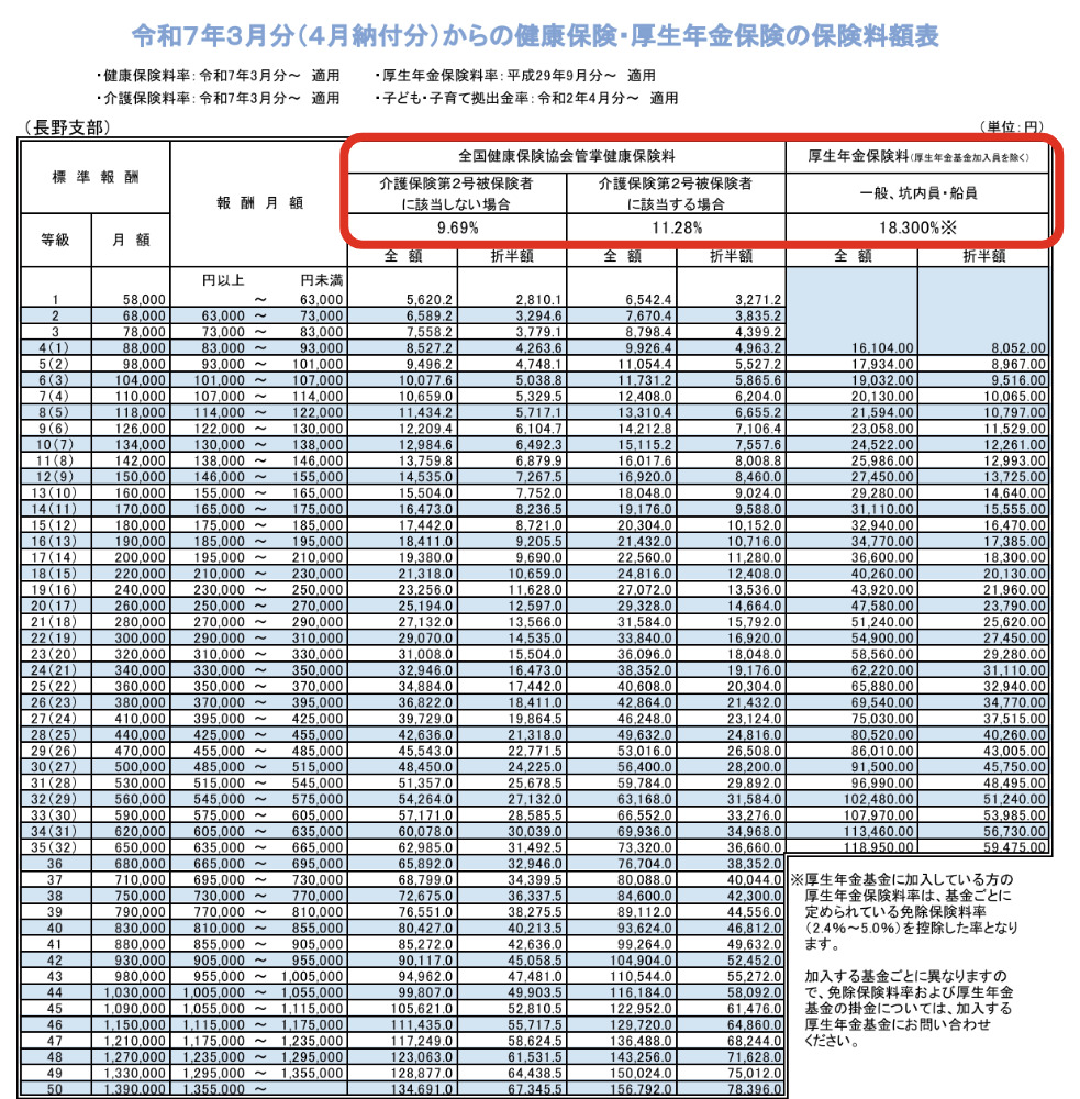 - 健康保険料:9.69%(介護保険に該当する場合:11.28%)