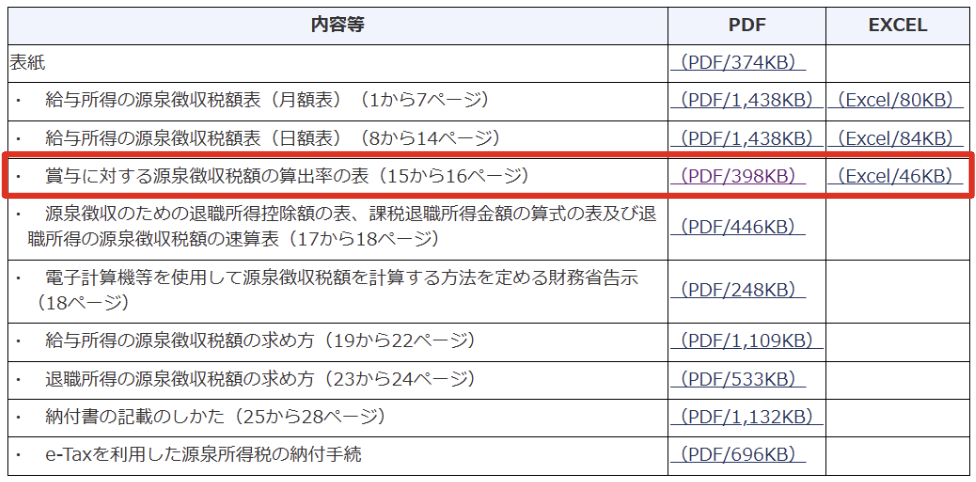 賞与の源泉徴収の計算には「賞与に対する源泉徴収税額の算出率の表」を使います。