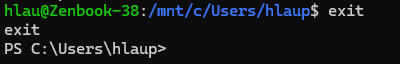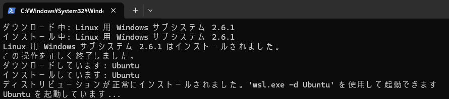 Ubuntuが正しく起動すると、PowerShellのプロンプト(例: PS C:\Users\user>)が消え、Ubuntuのシェルである Bashのプロンプト に切り替わります(例: user@computername:~$)。