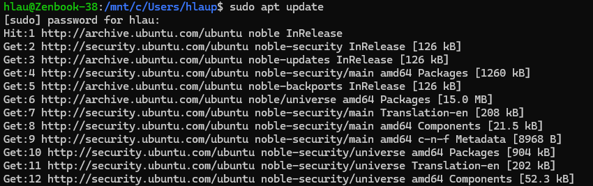sudo apt update実行するとパスワードを求められます。入力するとパッケージのリストを更新します(※アップデート可能なリストを更新するのみでアップデートまではしません)