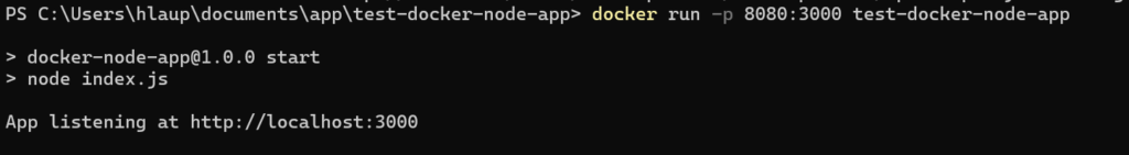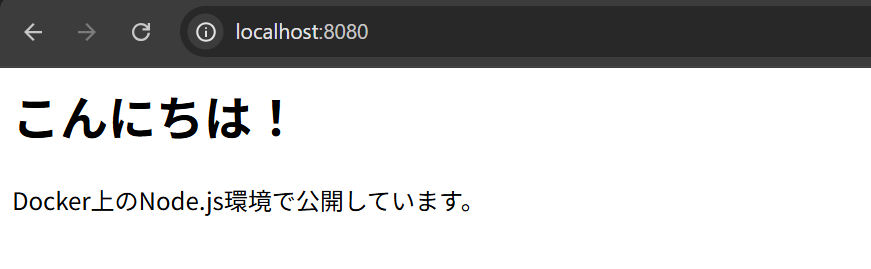 これにより、http://localhost:8080 でアクセスできるようになり、そのリクエストがコンテナ内のNode.jsアプリ(3000番ポート)に届きます。