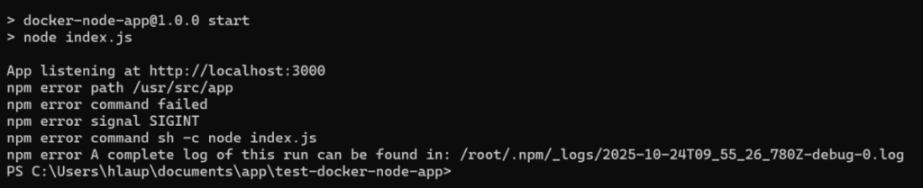 test-docker-node-appビルドするDockerイメージの名前です。これにより、後でこの名前を使ってイメージを参照したり、コンテナを起動したりできます。バージョン(タグ)を指定しない場合、自動的に最新版を示す:latestが付きます(例: test-docker-node-app:latest)。
