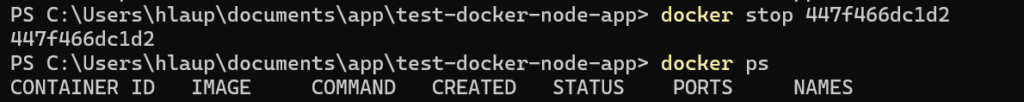 停止した後に、再度docker ps を実行すると先ほどのコンテナが表示されなくなり、停止したことがわかります。