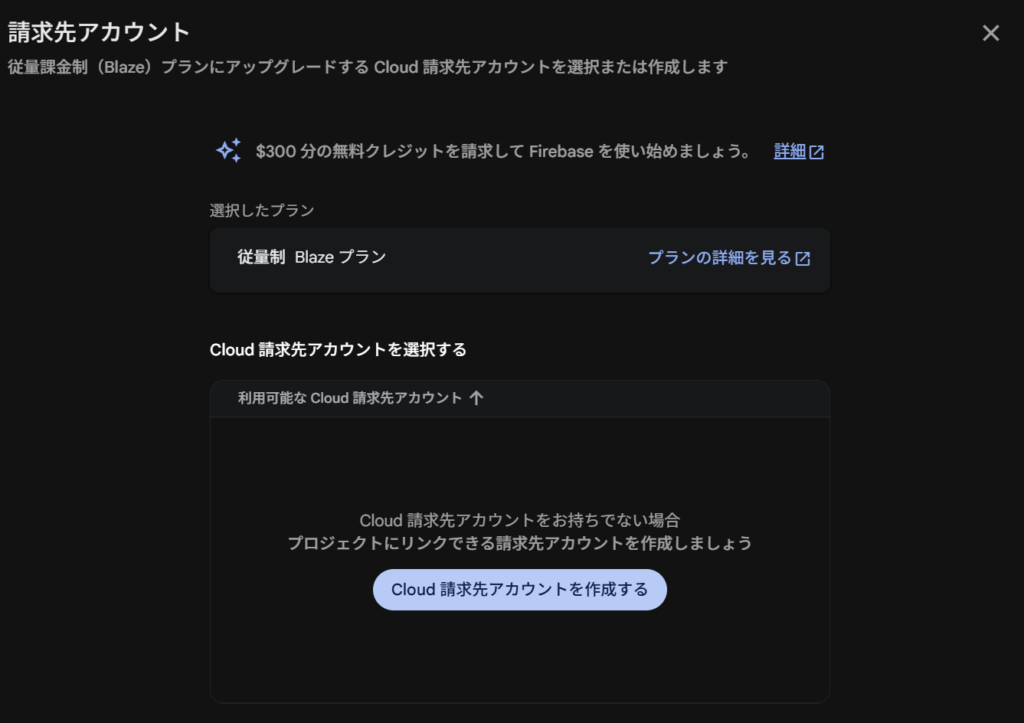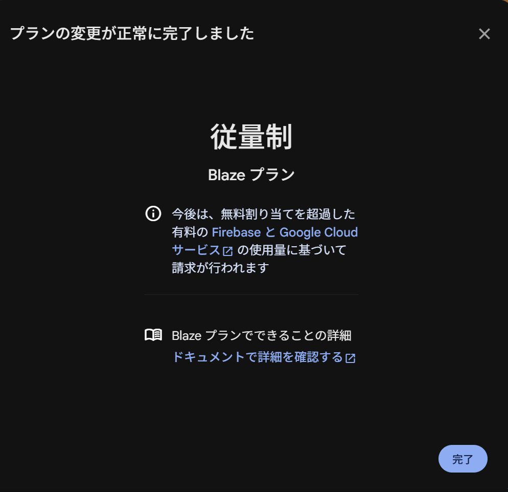 請求先アカウントの紐づけが完了したら、Blazeプランを使用できます。