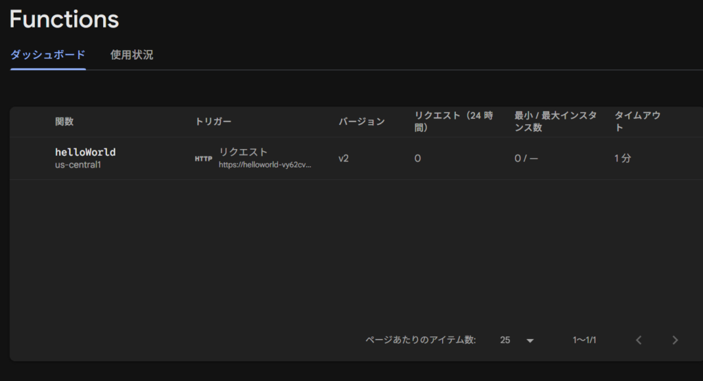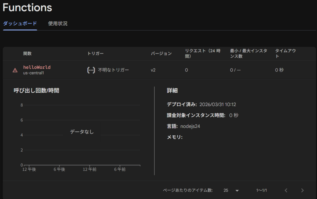 デプロイが完了すると、Firebaseコンソールのfunctionsにデプロイした関数が表示されます。
