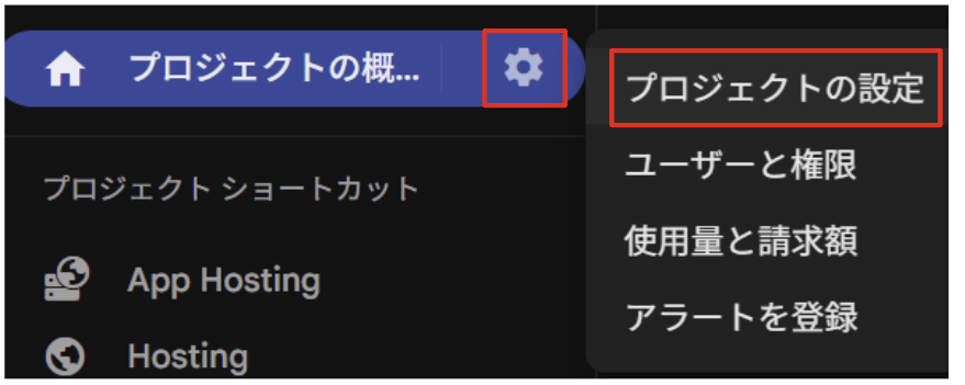 Firebaseコンソールの対象のアプリに入り、「プロジェクトの概要 > プロジェクトの設定」へと進みます。