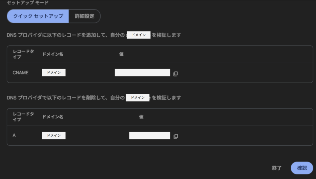 今回はアプリ専用に発行したサブドメインなので、クイックセットアップを使います。