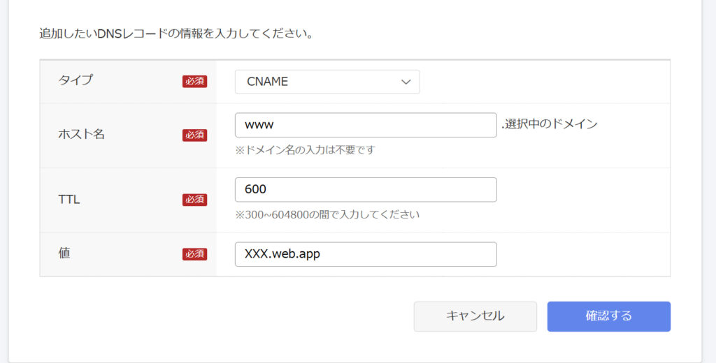「このドメインにアクセスが来たら、あっちのドメイン(Firebaseのサーバー)に転送してね」という指示を出します。