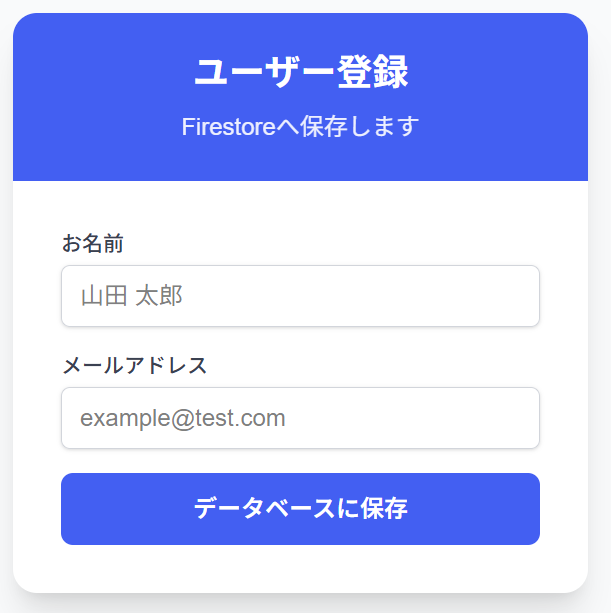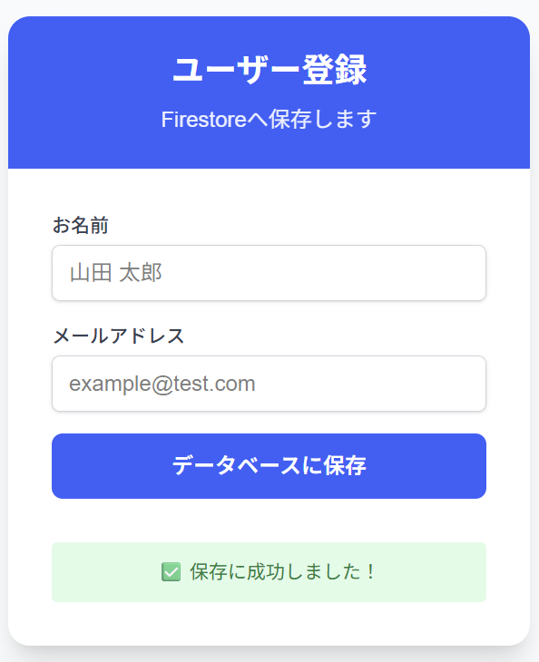 「データベースに保存」をクリックすると、入力データをFirestorageに保存します。