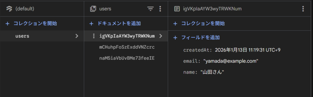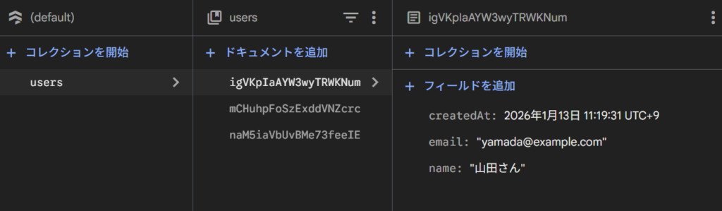 Firestoreのデータベースを確認すると指定したコレクション(users)に対象のドキュメントが保存されていることがわかります。