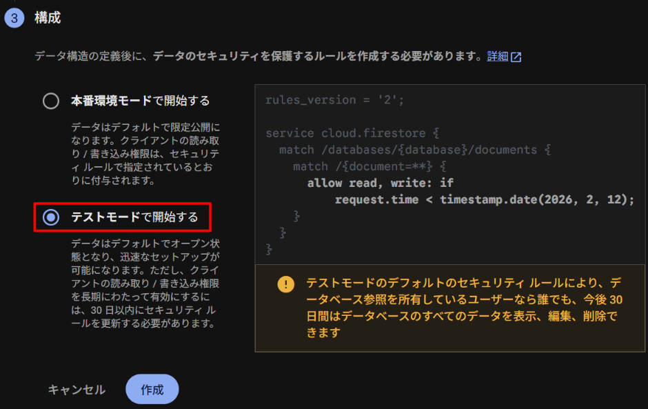 「テストモードで開始する」を選び「作成」をクリックします。