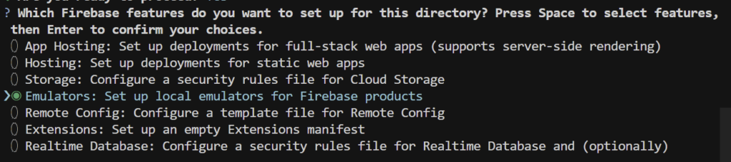 firebase init既にfirebase initを実行したことがあっても、再度実行して問題ありません。既存のデータは上書きや削除されずに残ります。
