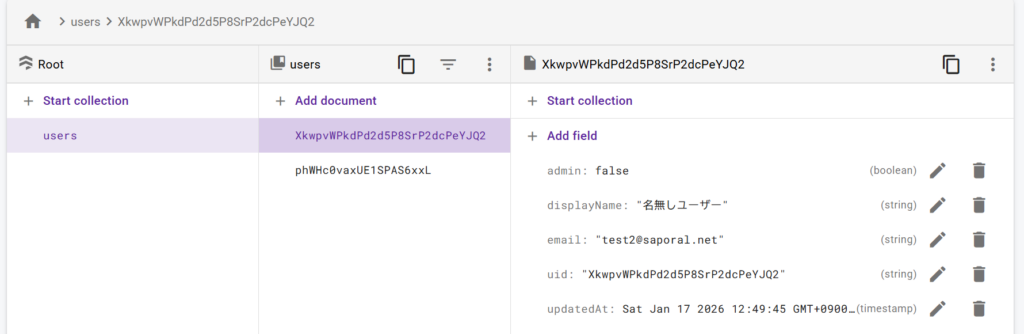 クラウド上のFirebaseと同じく、各サービスにアクセスし、手動でデータの追加や編集をすることもできます。