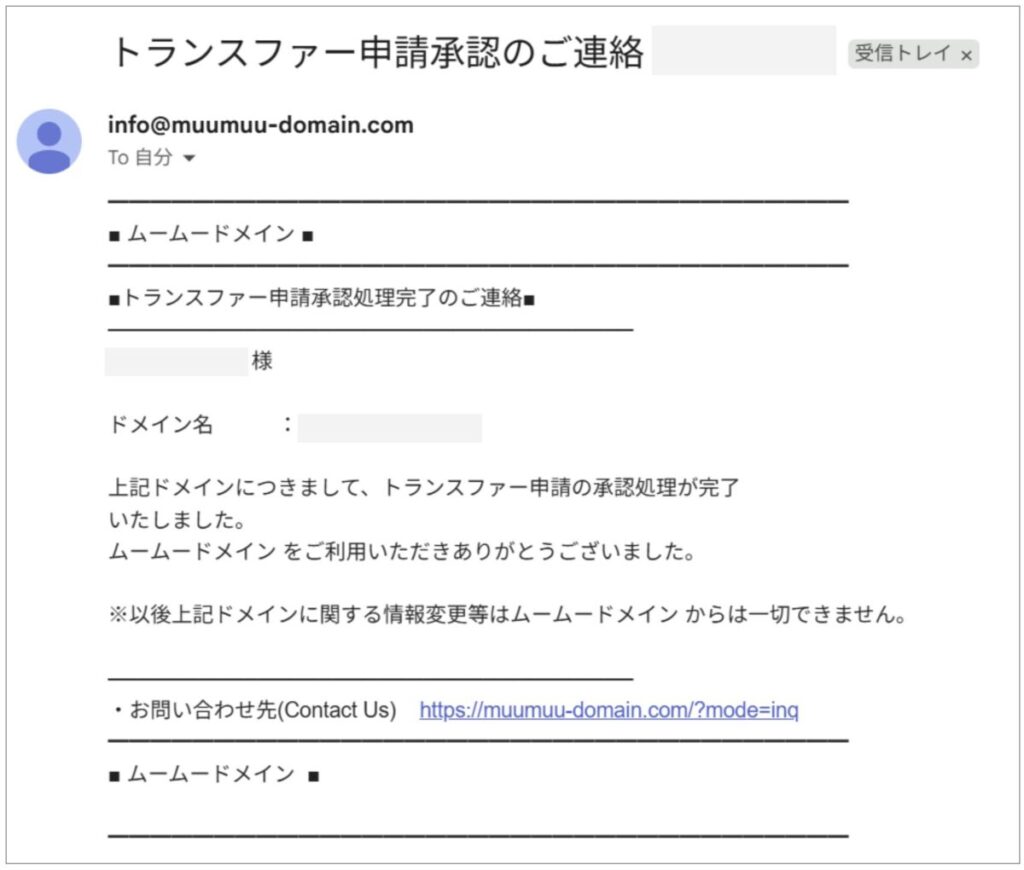 移管先のレジストラから正式に移管が完了した旨のメールが届きます。