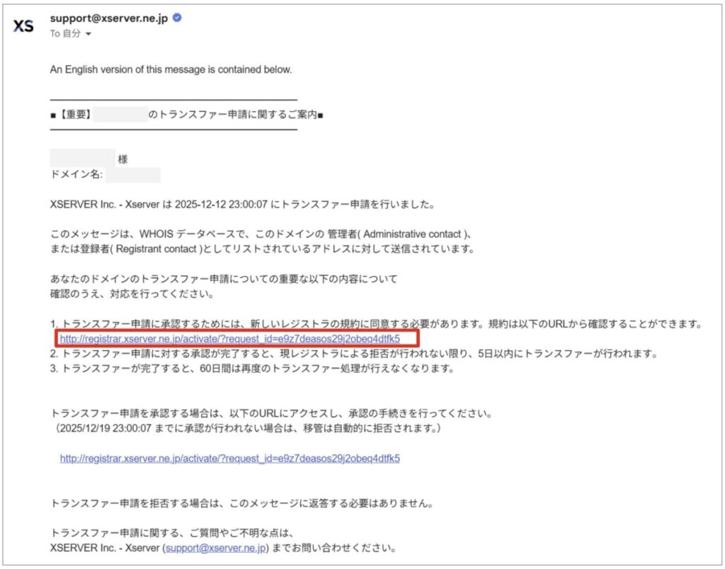 http://registrar.xserver.ne.jp/activate/?request_id=9u6bz6trl46px34zcdpsjlxl - トランスファー申請に対する承認が完了すると、現レジストラによる拒否が行われない限り、5日以内にトランスファーが行われます。