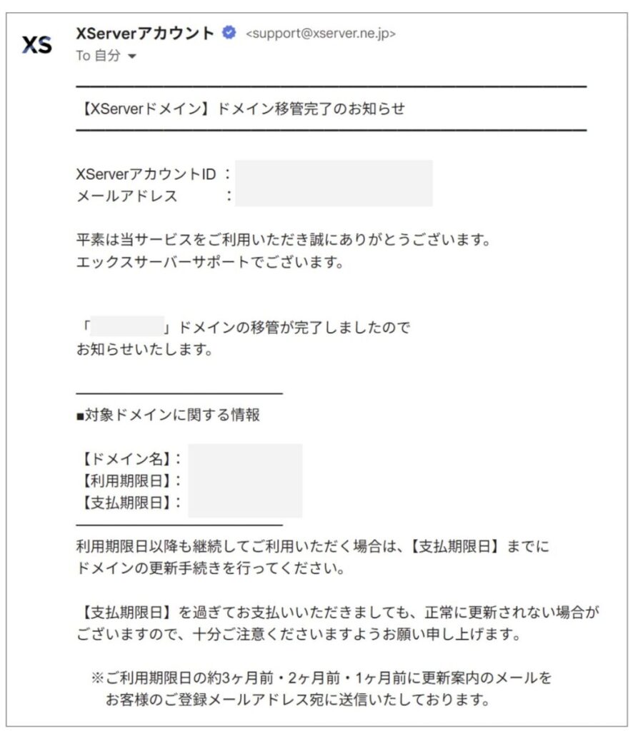 移管処理が完了すると、移管先のレジストラ(Xserver)から移管完了のメールが届きます。