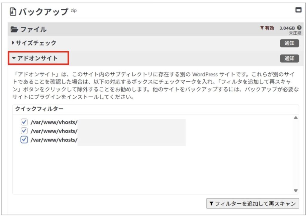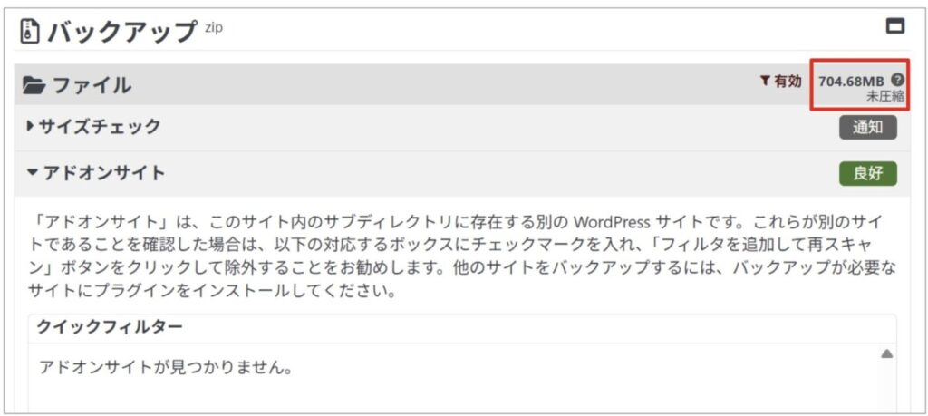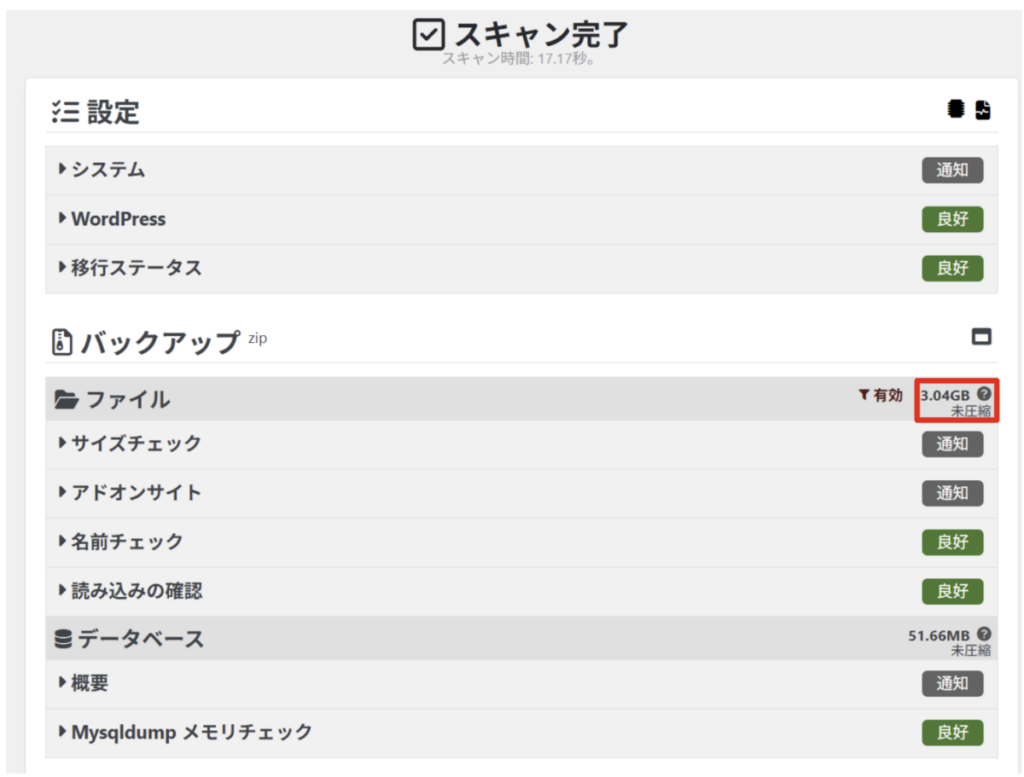 同一ディレクトリに他のWordPressサイトを構築している場合に検出した容量が大きくなることがあります。