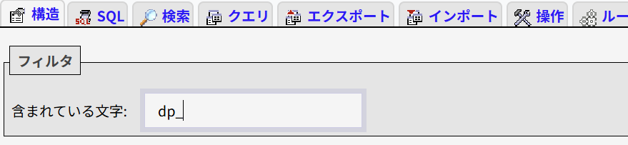 phpMyAdminにログインし、対象のデータベースを選択した後に、「構造」のフィルタで「dp_」と入力します。