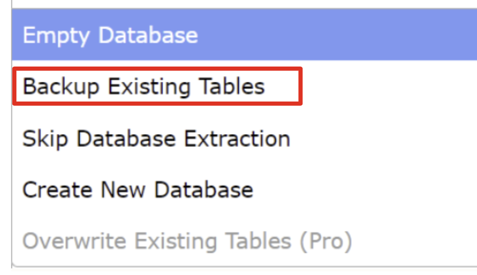 一番のポイントとなるのは、データベースを移管するActionで「Backup Existing Tables」を選択することです。