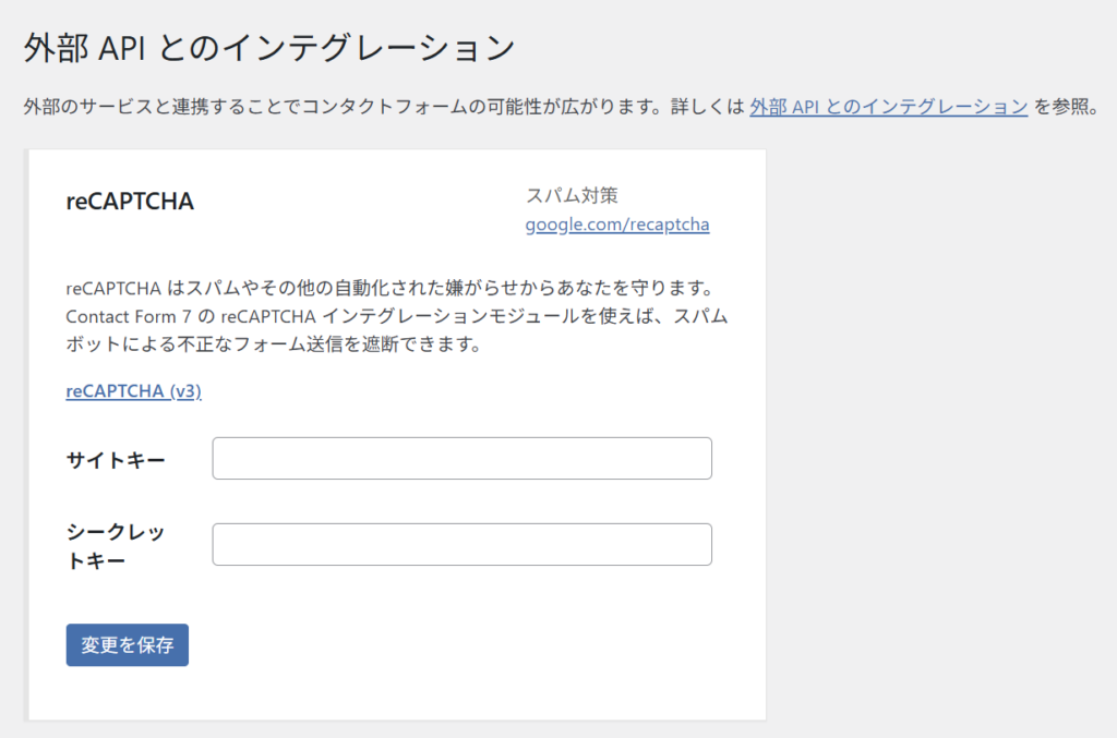 インテグレーションを選択すると、サイトキーとシークレットキーを入力するだけで超簡単にreCAPTCHAを設定することができます。